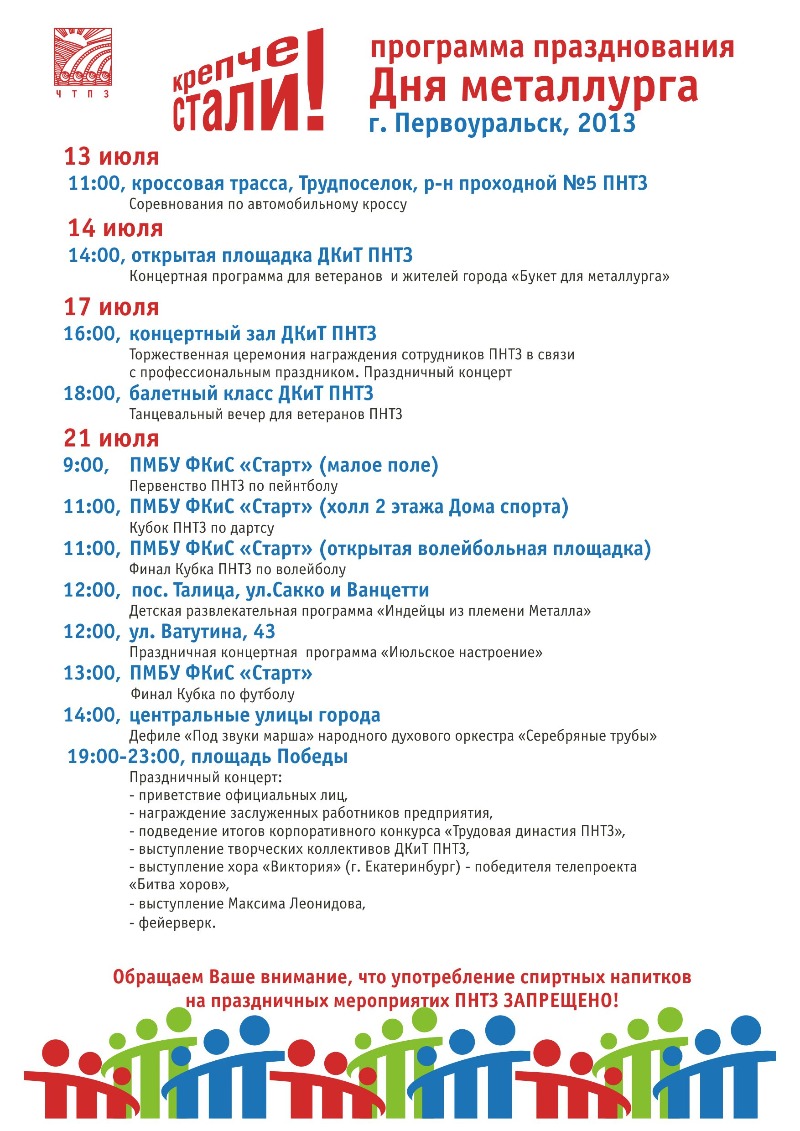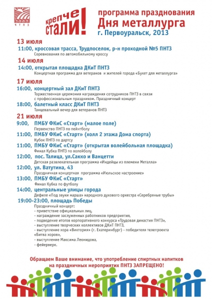Празднество продлится несколько дней. Сегодня, 17 июля во Дворце культуры ПНТЗ состоится чествование лучших сотрудников, награждение корпоративными, ведомственными и отраслевыми наградами. Основное празднование Дня металлурга пройдет 21 июля.