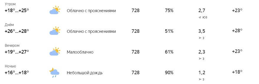 Вот так выглядит прогноз на сегодняшний день. Обратите внимание, осадки все-таки ожидаются, так что захватите на всякий случай из дому зонтики.