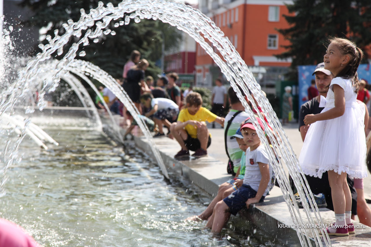 Жаркое солнышко «загоняет» юных первоуральцев в городской фонтан.